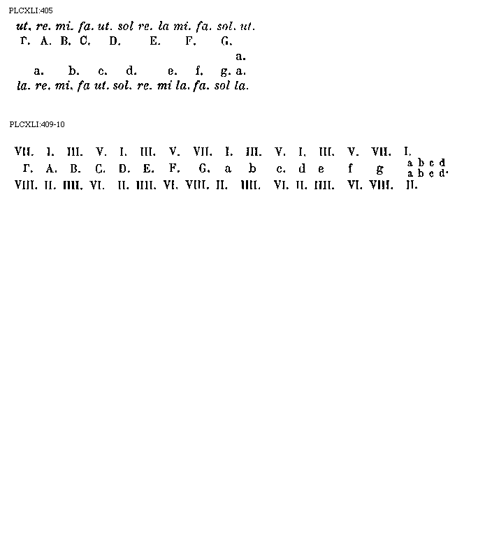 [PLCXLI:405; text: ut. re. mi. fa. ut. sol re. la mi. fa. sol. ut. [Gamma]. A. B. C. D. E. F. G. a. b. c. d. e. f. g. a. la. re. mi. fa ut. sol. re. mi la. fa. sol la.] [GUIRRH 01GF]