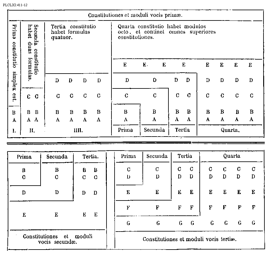 [PLCXLI:411-12; text: Constitutiones et moduli vocis primae. Prima constitutio simplex est. Secunda constitutio habet duas formulas. Tertia constitutio habet formulas quatuor. Quarta constitutio habet modulos octo, et continet omnes superiores constitutiones. Prima, Secunda, Tertia, Quarta, A, B, C, D, E, F, G, I. II. III. Constitutiones et moduli vocis secundae. Constitutiones et moduli vocis tertiae.] [GUIRRH 02GF]