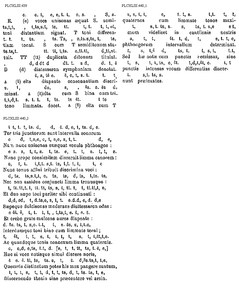 [PLCXLIII:441-42,1; text: Ter tria junctorum sunt intervaba sonorum. Nam hunc unisonas exaequat vocula phthongos: Nunc prope consimilem discernit limma canorem: Nunc tonus affini tribuit discrimina voci: Necnon assitue conjuncti limma tenusque: Et duo saepe toni pariter sibi continuati: Sepeque dulcisonas moderans diatissaron odas: Et crebro grate mulcens aures diapente: Interdumque tonibino cum limmate terni: Ac quandoque tonis connexum limma quaternis. Haec si voce notisque simul discernere noris, Quemvis distinctum potes his mox pangere cantum Discernendo thesin sine proecentore vel arsin. t, s, ts, d, [Delta], e, tt, ed, [Delta][Delta], [Delta]s, [Delta]t] [HERVERP 02GF]