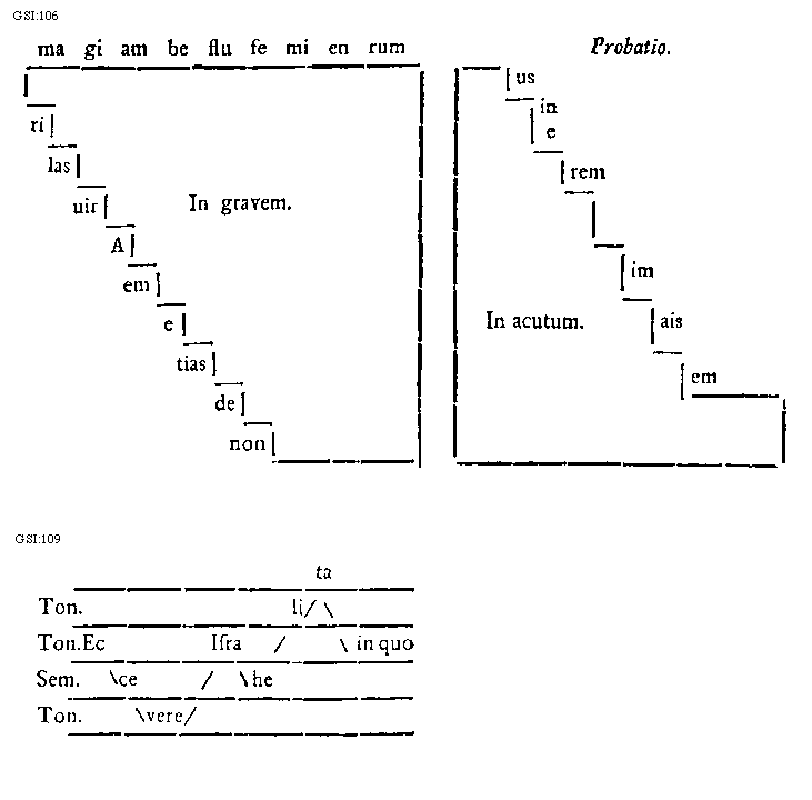 [106] [GSI:106; text: ma, gi, am, be, flu, fe, mi, en, rum, ri, las, uir, A, em, e, tias, de, non, In gravem. Probatio, us, in, e, rem, im, ais, em, In acutum.] [HUCHAR 01GF]