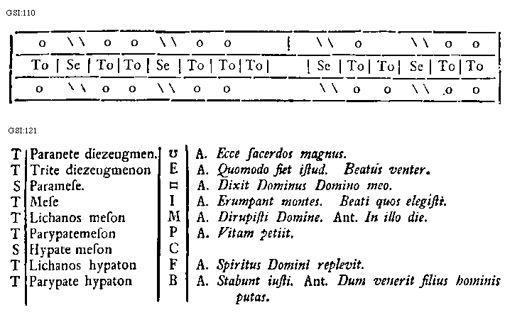 [GSI:121; text: Tonus, Semitonium, Paranete diezeugmenon, Trite diezeugmenon, Paramese, Mese, Lichanos meson, Parypatemeson, Hypate meson, Lichanos hypaton, Parypate hypaton, Antiphona Ecce sacerdos magnus. Antiphona Quomodo fiet istud. Beatus venter. Antiphona Dixit Dominus Domino meo. Antiphona Erumpant montes. Beati quos elegisti. Antiphona Dirupisti Domine. Antiphona In illo die. Antiphona Vitam petiit. Antiphona Spiritus Domini replevit. Antiphona Stabunt iusti. Antiphona Dum venerit filius hominis putas. E, I, M, P, C, F, B] [HUCHAR 02GF]