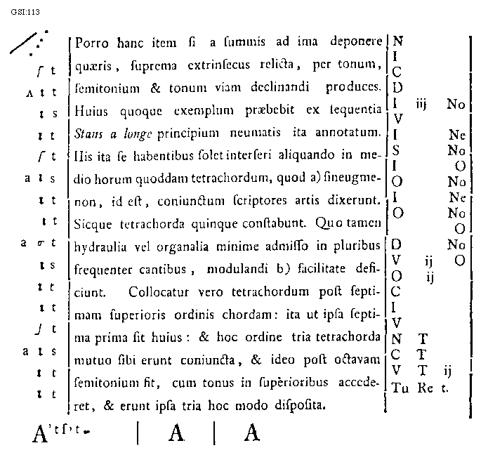 [113] [GSII:113; text: No, Ne, O, tonus, semitonium, Porro hanc item si a summis ad ima deponere quaeris, suprema extrinsecus relicta, per tonum, semitonium et tonum viam declinandi produces. Huius quoque exemplum praebebit ex sequentia Stans a longe principium neumatis ita annotatum. His ita se habentibus solet interseri aliquando in medio horum quoddam tetrachordum, quod sineugmenon, id est, coniunctum scriptores artis dixerunt. Sicque tetrachorda quinque constabunt. Quo tamen hydraulia vel organalia minime admisso in pluribus frequenter cantibus, modulandi facilitate deficiunt. Collocatur vero tetrachordum post septimam superioris ordinis chordam: ita ut ipsa septima prima sit huius: et hoc ordine tria tetrachorda mutuo sibi erunt coniuncta, et ideo post octavam semitonium fit, cum tonus in superioribus accederet, et erunt ipsa tria hoc modo disposita.] [HUCHAR 04GF]