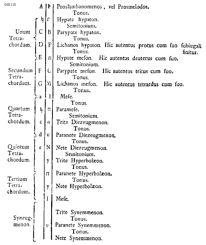 [115] [GSI:115; text: Unum Tetrachordum. Secundum Tetrachordum. Quartum Tetrachordum. Quintum Tetrachordum. Tertium Tetrachordum. Syneugmenon. A, [sqb], C, D, E, F, G, a, c, d, e, [Gamma], B, [Pi], C, M, I, [Theta], u, N, y, Tonus. Semitonium. Proslambanomenos, vel Prosmelodos. Hypate hypaton. Parypate hypaton. Lichanos hypaton. Hic autentus protus cum suo subiugali finitur. Hypate meson. Hic autentus deuterus cum suo. Parypate meson. Hic autentus tritus cum suo. Lichanos meson. Hic autentus tetrardus cum suo. Mese. Paramese. Trite Diezeugmenon. Paranete Diezeugmenon. Nete Diezeugmenon. Trite Hyperbolaeon. Paranete Hyperbolaeon. Nete Hyperbolaeon. Trite Synemmenon. Paranete Synemmenon. Nete Synemmenon.] [HUCHAR 05GF]