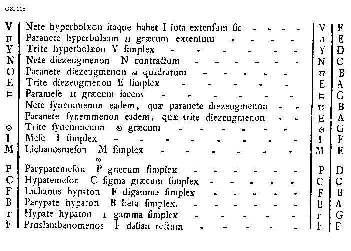 [GSI:118; text: Nete hyperbolaeon itaque habet I iota extensum sic, Paranete hyperbolaeon [Pi] graecum extensum, Trite hyperbolaeon Y simplex, Nete diezeugmenon N contractum, Paranete diezeugmenon [Omega] quadratum, Trite diezeugmenon E simplex, Paramese [Pi] graecum iacens, Nete synemmenon eadem, quae paranete diezeugmenon, Paranete synemmenon eadem, quae trite diezeugmenon, Trite synemmenon [Theta] graecum, Mese I simplex, Lichanosmeson M simplex, Parypatemeson P [ro supra lin.] graecum simplex, Hypatemeson C sigma graecum simplex, Lichanos hypaton F digamma simplex, Parypate hypaton B beta simplex. Hypate hypaton [Gamma] gamma simplex, Proslambanomenos [signum] dasian rectum, A, B, C, D, E, F, G, V, [Pi], Y, N, O, E, [Theta], I, M, P, C, F, B, [Gamma]] [HUCHAR 06GF]