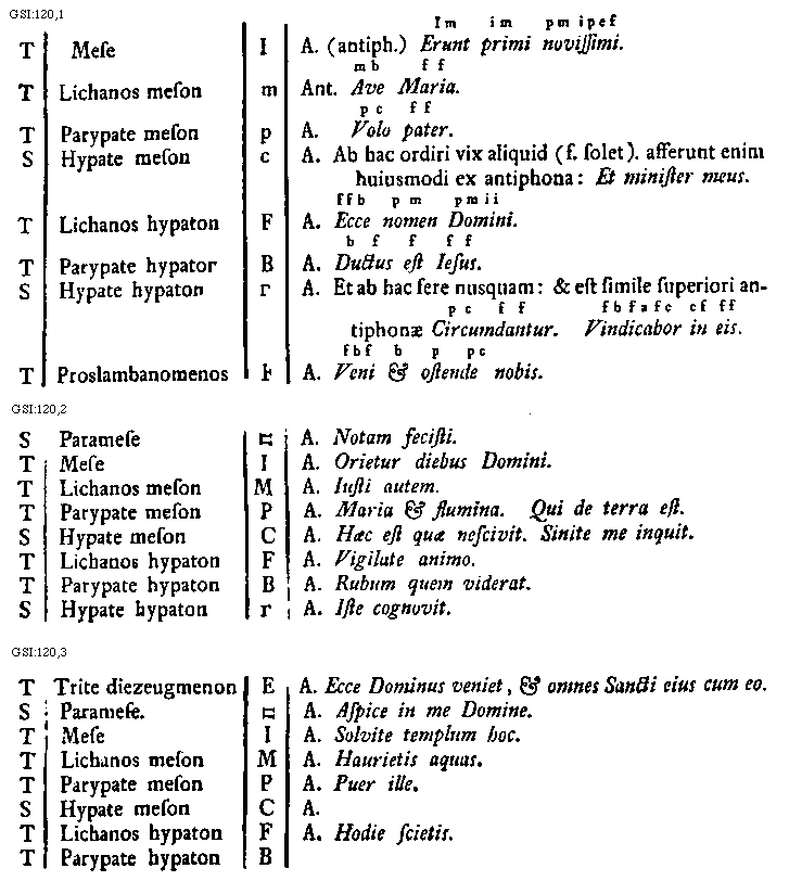 [GSI:120,1; text: Tonus, Semitonium, Mese, Lichanos meson, Parypate meson, Hypate meson, Lichanos hypaton, Parypate hypaton, Hypate hypaton, Proslambanomenos, Antiphona Erunt primi novissimi [Im im pm ipef supra lin.]. Antiphona Ave Maria [mb ff supra lin.]. Antiphona Volo pater [pc ff supra lin.]. Antiphona Ab hac ordiri vix aliquid (fortasse solet). afferunt enim huiusmodi ex antiphona: Et minister meus. Antiphona Ecce nomen Domini [ffb pm pmii supra lin.]. Antiphona Ductus est Iesus [b ffff supra lin.]. Antiphona Et ab hac fere nusquam: et est simile superiori antiphonae Circumdantur [pc ff supra lin.]. Vindicabor in eis [fbfafc cf ff supra lin.]. Antiphona Veni et ostende nobis [fbf b p pc supra lin.]. I, m, p, c, F, B, [Gamma]] [HUCHAR 07GF]