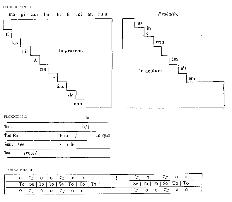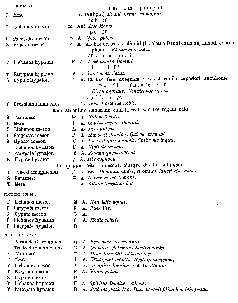 [PLCXXXII:923-24; text: Tonus, Semitonium, Mese, Lichanos meson, Parypate meson, Hypate meson, Lichanos hypaton, Parypate hypaton, Hypate hypaton, Proslambanomenos, Antiphona Erunt primi novissimi [I m i m p m i p e f supra lin.], Antiphona Ave Maria [m b f f supra lin.]. Antiphona Volo pater [p c f f supra lin.]. Antiphona Ab hac ordiri vix aliquid (fortasse solet) afferunt enim huiusmodi ex antiphona: Et minister meus. Antiphona Ecce nomen Domini [f f b p m p m i i supra lin.]. Antiphona Ductus est Jesus [b f f f f supra lin.]. Antiphona Et hac fere nusquam: et est simile superiori antiphonae Circumdantur [p c f f supra lin.]. Vindicabor in eis [f b f a f c c f f f supra lin.]. Antiphona Veni et ostende nobis [f b f b p p c supra lin.]. I, ni, p, c, F, B, G, [Gamma], Item Autentum deuterum cum laterali suo hae regunt octo. Paramese, Antiphona Notam fecisti. Antiphona Orietur diebus Domini. Antiphona Justi autem. Antiphona Maria et flumina. Qui de terra est. Antiphona Haec est quae nescivit. Sinite me inquit. Antiphona Vigilate animo. Antiphona Rubum quem viderat. Antiphona Iste cognovit. M, P, C, His quoque Tritus autentus, eiusque ducitur subjugalis. Trite diezeugmenon, Antiphona Ecce Dominus veniet, et omnes Sancti eius cum eo. Antiphona Aspice in me Domine. Antiphona Solvite templum hoc. E] [HUCHARM 05GF]