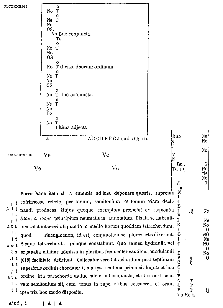 [PLCXXXII:915-16; text: Ve, Duo, No, e, Ne, I, V, N, Re.., O, Ta IIIJ, f. N, C, D, V, S, Tu, Re, IIJ, IJ, T, t. NO, A, a, [Gamma], [Sigma], tonus, semitonium, Porro hanc item si a summis ad ima deponere quaeris, suprema extrinsecus relicta, per tonum, semitonium et tonum viam declinandi produces. Hujus quoque exemplum praebebit ex sequentia Stans a longe principium neumatis ita annotatum. His ita se habentibus solet interseri aliquando in medio horum quoddam tetrachordum, quod sineugmenon, id est, conjunctum scriptores artis dixerunt. Sicque tetrachorda quinque constabunt. Quo tamen hydraulia vel organalia minime admisso in pluribus frequenter cantibus, modulandi facilitate deficiunt. Collocatur vero tetrachordum post septimam superioris ordinis chordam: ita uta ipsa sentima prima sit hujus: et hoc ordine tria tetrachorda mutuo sibi erunt conjuncta, et ideo post octavam semitonium sit, cum tonus in superioribus accederet, et erunt ipsa tria hoc modo disposita.] [HUCHARM 02GF]