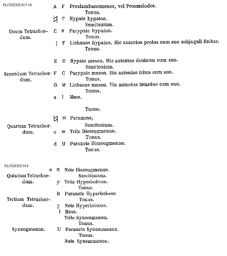 [PLCXXXII:917-18; text: A, F, Proslambanomenos, vel Prosmelodos. Tonus. [sqb], [Gamma], Hypate hypaton. Semitonium. Unum Tetrachordum. C, B, Parypate hypaton. Lichanos hypaton. Hic autentus protus cum suo subjugali finitur. E, [Pi], Hypate meson. Hic autentus deuterus cum suo. Secundum Terachordum. Parypate meson. Hic autentus tritus cum suo. G, M, Lichanos meson. Hic autentus tetardus cum suo. a, l, Mese. Paramese, Quartum Tetrachordum. [Theta], Trite Diezeugmenon. d, U, Paranete Diezeugmenon.] [HUCHARM 03GF]