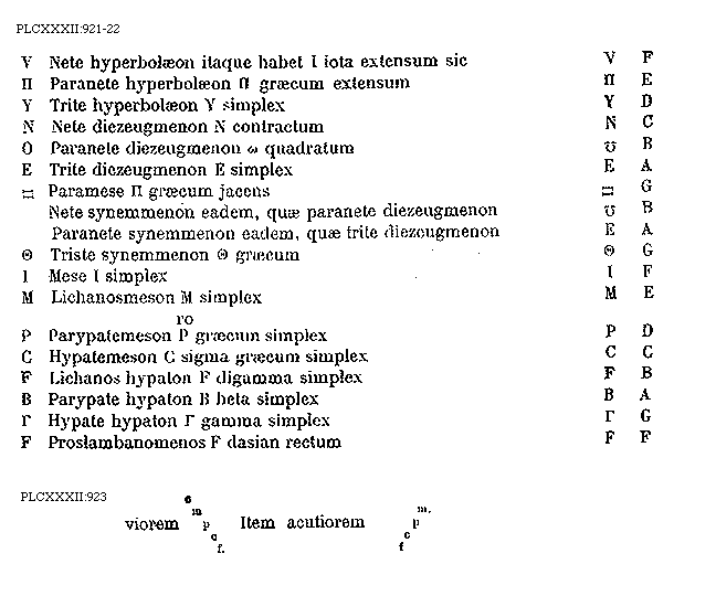 [PLCXXXII:921-22; text: Nete hyperbolaeon itaque habet I iota extensum sic, Paranete hyperbolaeon [Pi] graecum extensum, Trite hyperbolaeon Y simplex, Nete diezeugmenon N contractum, Paranete diezeugmenon [Omega] quadratum, Trite diezeugmenon E simplex, Paramese [Pi] graecum jacens, Nete synemmenon eadem, quae paranete diezeugmenon, Paranete synemmenon eadem, quae trite diezeugmenon, Triste synemmenon [Theta] graecum, Mese I simplex, Lichanosmeson M simplex, Parypatemeson P [ro supra lin.] graecum simplex, Hypatemeson C sigma graecum simplex, Lichanos hypaton F digamma simplex, Parypate hypaton B beta simplex. Hypate hypaton [Gamma] gamma simplex, Proslambanomenos F dasian rectum, A, B, C, D, E, F, G, V, [Pi], Y, N, O, E, [Theta], I, M, P] [HUCHARM 04GF]