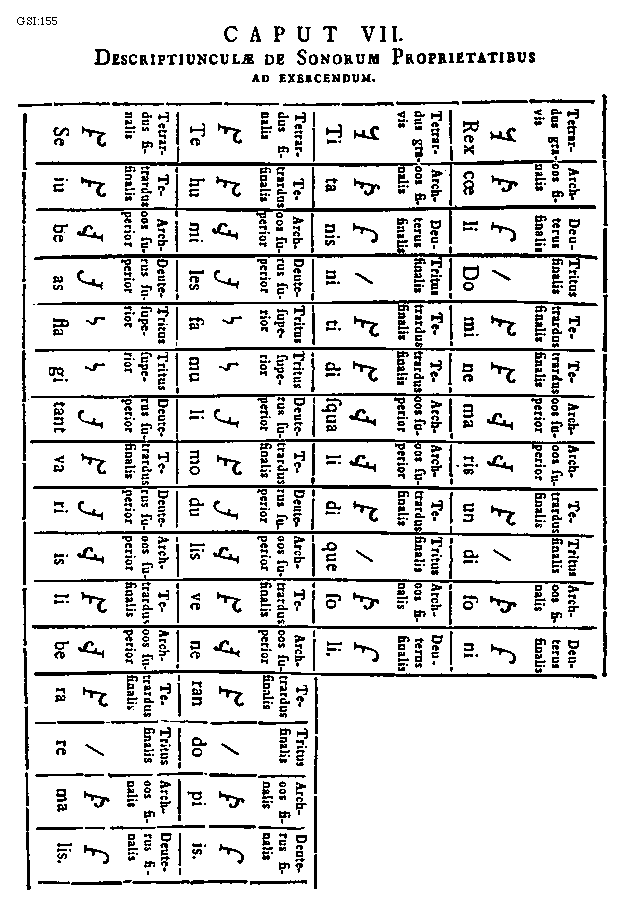 Igitur quia, ut dictum est, eiusdem conditionis quatuor et quatuor natura statuit, ita et notae pene sunt eaedem. Solummodo tetrachordorum differentia versis in varium characteribus indicatur. Primus finalis seu terminalis D. [signum] dasiam, inclinum s. ad caput, ita [signum]. Secundus finalis, c. versum ad caput, ita [signum]. Tertius finalis I simplex et inclinum, ita [signum]. Quartus finalis, c. dimidium ad caput ita [signum]. Graves retroversi finales ita [signa]. Superiores demissi capita finales, ita [signa]. Excellentes demissi capita graves, ita [signa]. Excepto trito, qui in gravibus notam habet N. inclinum [signum]: in superioribus N versum [signa] In excellentibus iota praefixum (alias perfixum) [signum]. Duo residui signa habent [signa] iacentis proti et deuteri. Sunt omnes XVIII. quo videlicet singuli extremam suam symphoniam attingant, id est, quintum decimum sonum, unde post dicetur. Sunt et alia plura plurium sonorum signa inventa antiquitus, quibus evitatis has faciliores hic inserere curae fuit notas.