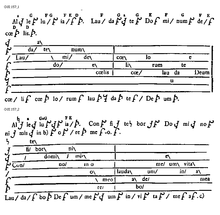 [GSI:157,1; text: Alleluia. Laudate Dominum de coelis. coeli coelorum laudate Deum.] [MUSENC 03GF]