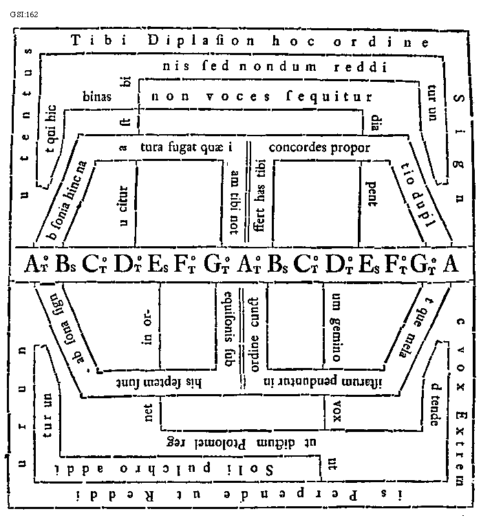 [GSI:162; text: Autentus Tibi Diplasione hoc ordine Signa, Ac vox Extremis Perpende ut Reddiur una, At qui hic binas non voces sequitur diapente, Ducitur ast binis sed nondum redditur una, Ad tende ut dictum Ptolomei regnet in ore, Dum gemino vox ut Soli pulchro additur una, At que mela istarum penduntur in ordine cuncta, Aequisonis sub his septem sunt ab sona signa, Ab sonia hinc natura fugat quae iam tibi nota, Affert has tibi concordes proportio dupla, A, B, C, D, E, F, G, Tonus, Semitonium] [MUSENC 07GF]