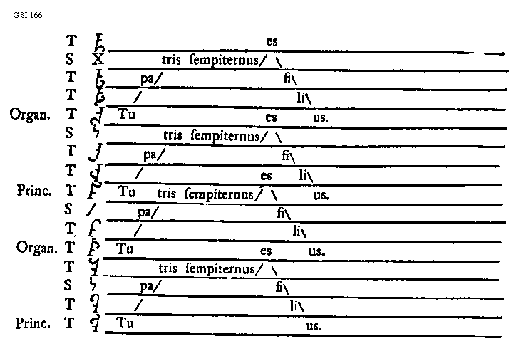[GSI:166; text: Organalis, Principalis, Tonus, Semitonium, Tu patris sempiternus es filius.] [MUSENC 10GF]