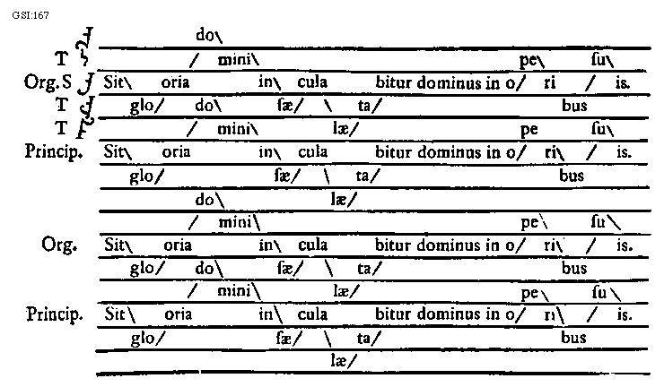 [GSI:167; text: Organalis, Principalis, Tonus, Semitonium, Sit gloria domini in saecula laetabitur dominus in operibus suis.] [MUSENC 11GF]