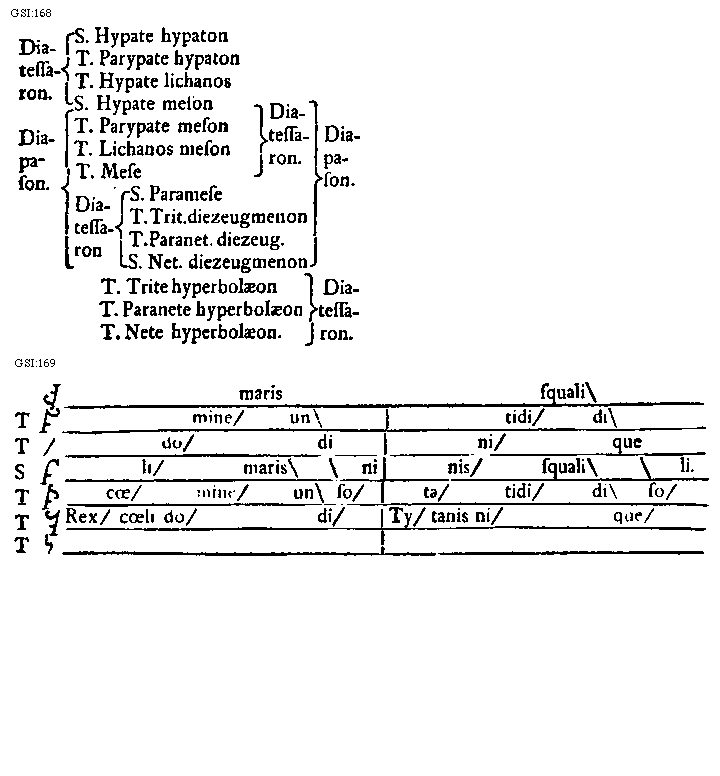 [GSI:168; text: Diatessaron. Semitonium, Hypate hypaton, Tonus, Parypate hypaton, Hypate lichanos, Hypate meson. Diapason. Parypate meson, Lichanos meson, Mese, Paramese, Trite diezeugmenon, Paranete diezeugmenon, Nete diezeugmenon, Trite hyperbolaeon, Paranete hyperbolaeon, Nete hyperbolaeon.] [MUSENC 12GF]
