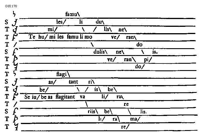 [GSI:170; text: Semitonium, Tonus, Te humiles famuli modulis venerando piis. Se iubeas flagitant variis liberare malis.] [MUSENC 13GF]