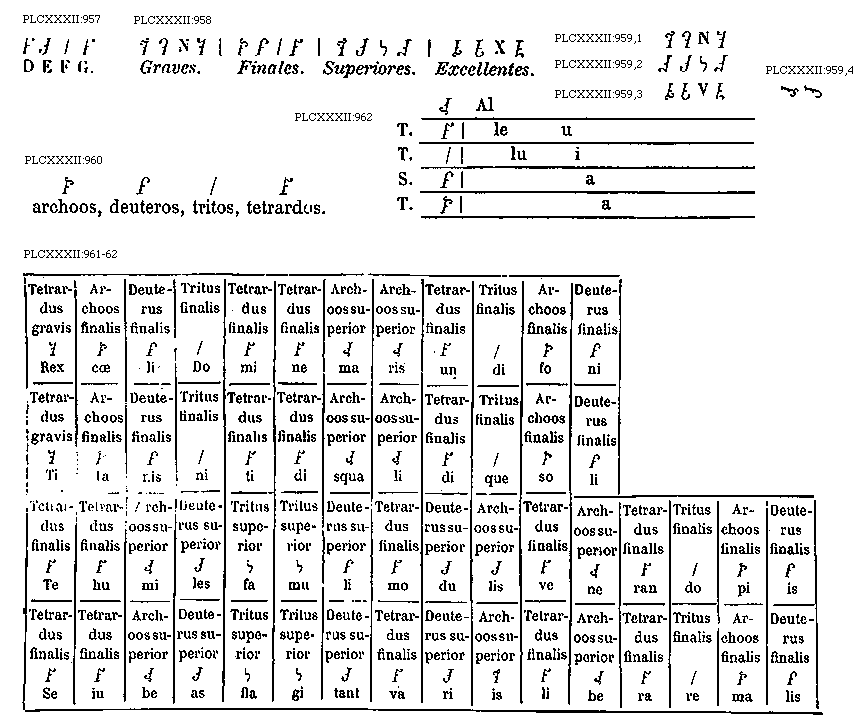 Finales seu terminales soni sub se habent unum tetrachordum, quod dicitur Gravium. Supra se autem duo, id est, Superiorum et Excellentium, cum residuis duobus sonis: videlicet quod simplex et legitimus cantus inferius non descendit, quam usque ad sonum quintum a finali suo. In primo duntaxat modo et secundo ab [signum] archoo vel proto finali usque in eundem gravem [signum]. In [960] tertio et quarto modo a [signum] deutero finali usque in eundem gravem [signum]. In quinto et sexto a / trito finali usque in eundem gravem N. In septimo et octavo a [signum] tetrardo finali usque in eundem gravem [signum]. At vero in acumine a quocumque finali suo usque tertium ejusdem nominis sonus efferri valet, id est, in usque Excellentes.