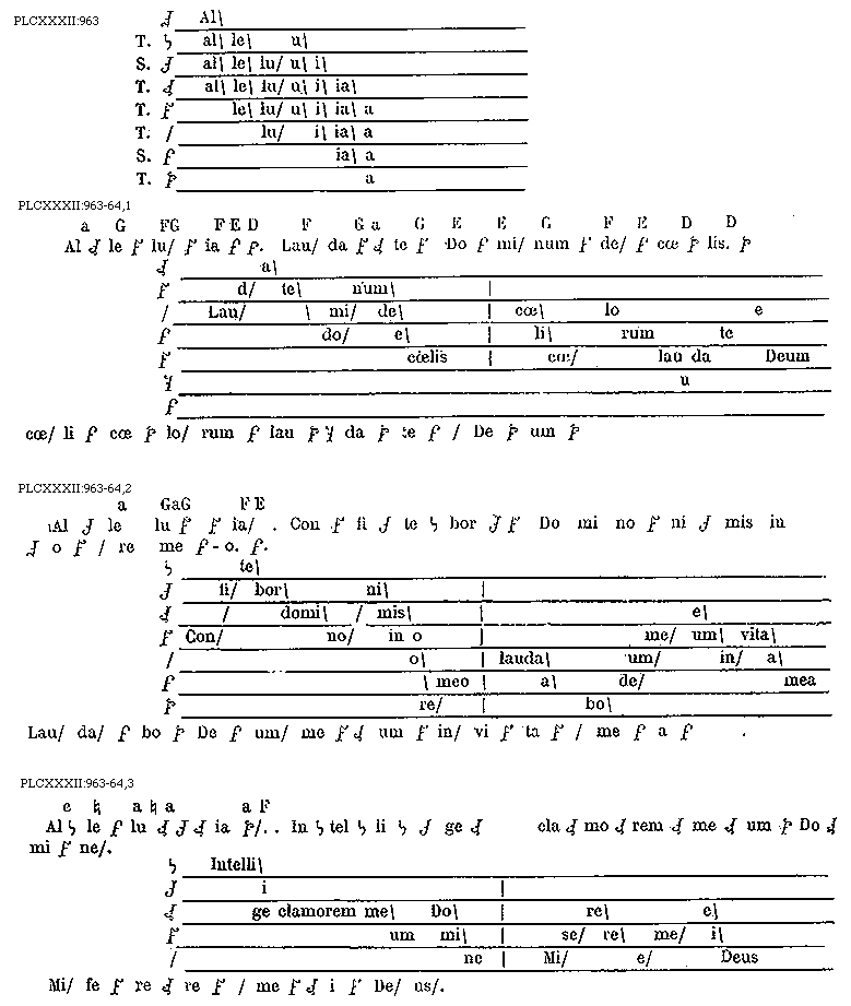 [PLCXXXII:963-64,2; text: a, G, F, E, Alleluia. Confitebor Domino nimis in ore meo. Laudabo Deum meum in vita mea.] [MUSENCH 02GF]