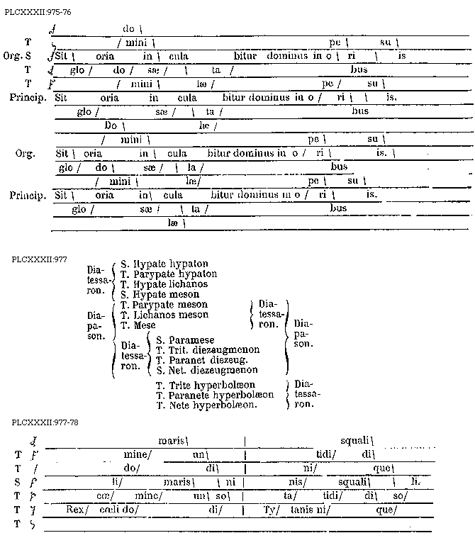 Ergo quoniam praedicti limitis [signum] oppositione brevi [979] diastemate coarctatur, et nisi in tribus vel quatuor sonis organalis vox spatium habet; idcirco secundum particularum positionem et loca mutat vagantibus enim particulis, dum modo cantilena in sursum prodat, modo in ima deponatur, et nunc quaelibet particula positionem habeat circa superiores sonos, nunc circa terminales, aliquando [980] circa graves, semper vox organalis positionum finalitatem eo jure subsequitur, ut subtus tetrardum sonum, in quem vel finalitas particulae devenerit, vel qui proximus ipsi finalitati suberit, nec ordiri levationem valeat, nec rite finalitatem deponere ceptum carmen exempli gratia: