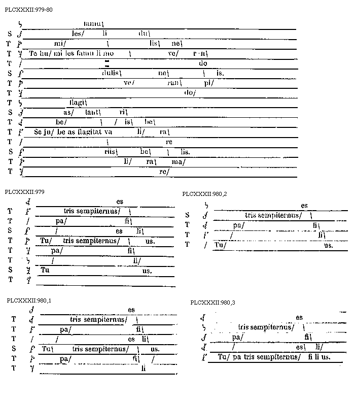 [PLCXXXII:979-80; text: Tonus, Semitonium, Te humiles famuli modulis venerando piis, Se jubeas flagitant variis liberare malis.] [MUSENCH 08GF]