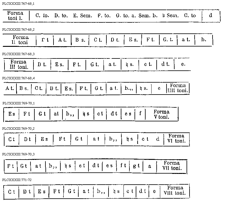 Habet itaque secundus tonus [Gamma], et primam A, et secundam B, quas non habet primus: et primus habet decimam c, et undecimam d, quas non habet secundus. Sunt autem horum plurimi cantus, qui ad [Gamma] et primam A et secundam B non deponuntur, ad decimam vel undecimam non elevantur, de quibus dubium est, an primi, an secundi sint toni: quorum ista discretio est. Ad octavam et nonam si non ascendunt, certissime de tono secundo sunt. Erunt itaque octava et nona utriusque communes, ad quas dum cantus ascendit, si diu in eis permaneat, sive tertio vel quarto eas repercutiat, aut si in octava incipiat, modi erit primi. Sin autem in inferioribus incipiat, et secundum quantitatem antiphonae rarissime ad illas ascendat, secundi erit modi. Alioquin juxta [768] formularum varietates et differentias discernuntur. Principia autem secundi toni sunt in [Gamma], ut: Educ de carcere; in A, ut: Omnes patriarchae; in C, ut: Nonne cor nostrum; in D, ut: Ecce in nubibus; in E, ut Animalia. Ecce Maria; in F, ut: Quem vidistis. In [Gamma] vero, B, vel E, vel G, rarissima exempla reperies.