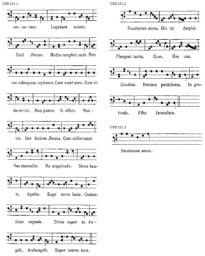 [121] [CSII:121,1; text: Lugebant autem. Dixit Jhesus. Hodie completi sunt. Non vos relinquam orphanos. Cum esset sero. Cum videritis. Non potest. Si offers. Montes. Iter faciens Jhesus. Cum sublevasset. Vos ascendite. Ne magnitudo Stans beata. Agatha. Euge serve bone. Cantantibus organis. Doleo super te. Angeli Archangeli. Super muros tuos.] [ODOINT 04GF]