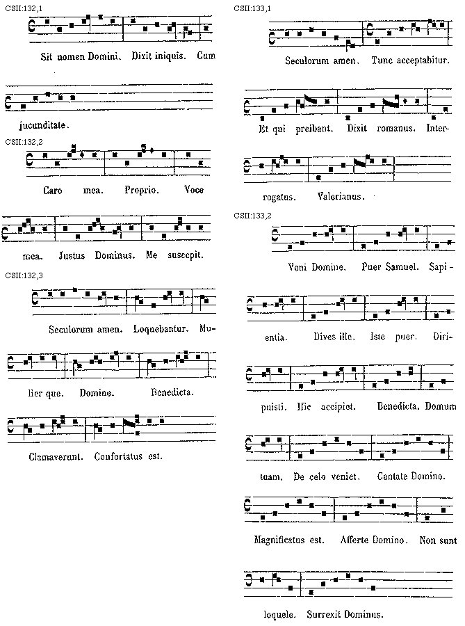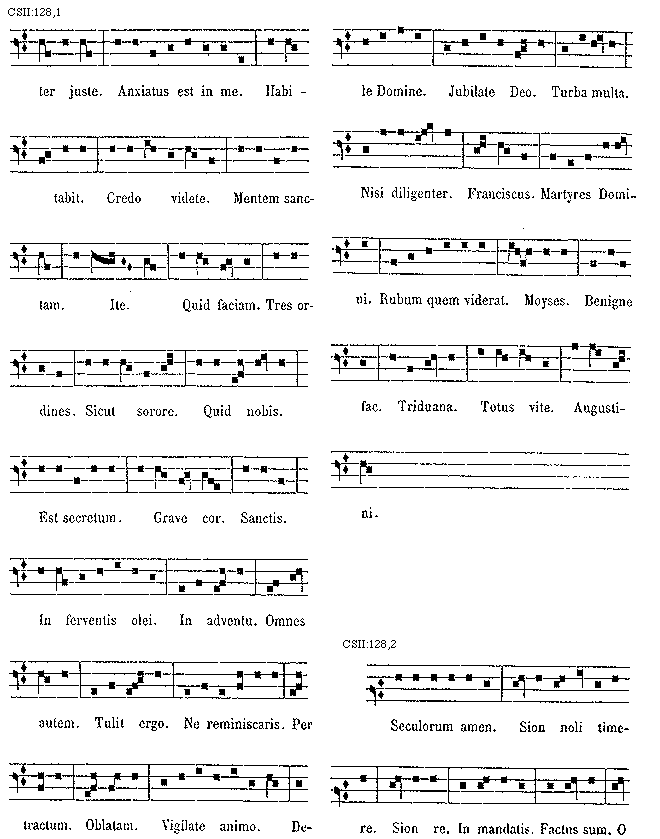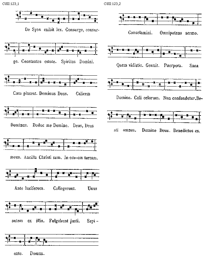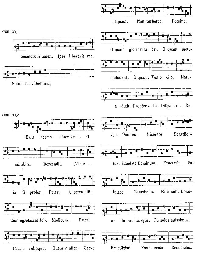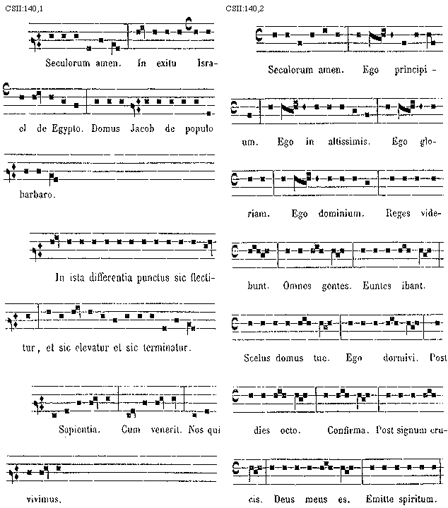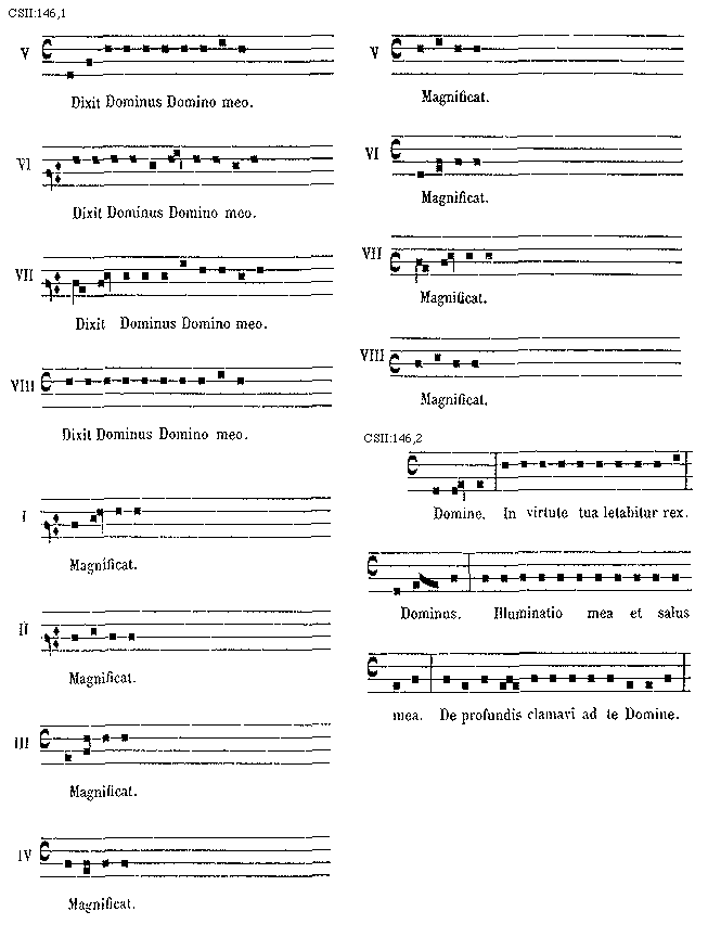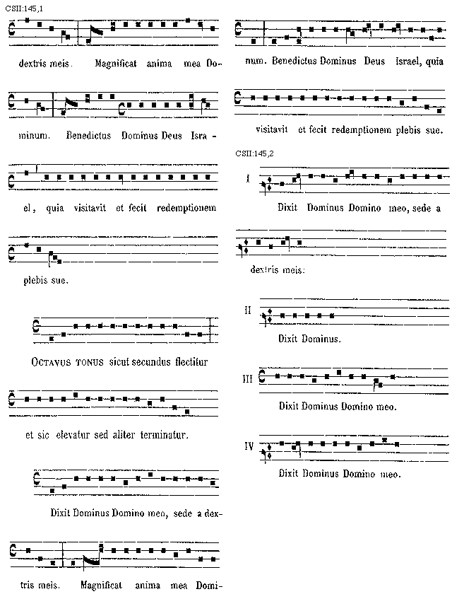 [145] [CSII:145,1; text: Magnificat anima mea Dominum. Benedictus Dominus Deus Israel, quia visitavit et fecit redemptionem plebis sue. Octavus tonus sicut secundus flectitur et sic elevatur sed aliter terminatur. Dixit Dominus Domino meo, sede a dextris meis.] [ODOINT 26GF]