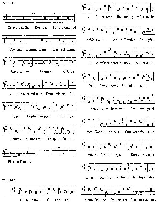 [124] [CSII:124,1; text: Semem cecidit. Domine. Tunc assumpsit. Ego sum. Domine Deus. Unus est enim. Benedicat nos. Framea. Oblatus est. Ego sum qui sum. Dum vivens. In lege. Credidi propter. Filii hominum. Isti sunt sancti. Templum Domini. Placebo Domino.] [ODOINT 07GF]