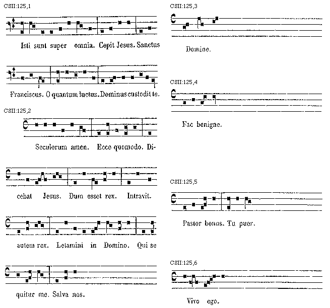 [125] [CSII:125,1; text: Isti sunt super omnia. Cepit Jesus. Sanctus Franciscus. O quantum luctus. Dominus custodit te.] [ODOINT 08GF]