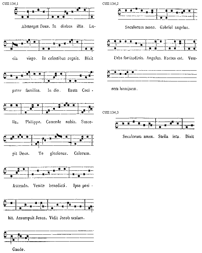[134] [CSII:134,1; text: Absterget Deus. In diebus illis. Lucia virgo. In celestibus regnis. Dixit pater familias. In die. Beata Cecilia. Philippe. Concede nobis. Suscepit Deus. Te gloriosus. Celorum. Ascendo. Venite benedicti. Ipse preibit. Assumpsit Jesus. Vidit Jacob scalam. Gaude.] [ODOINT 15GF]