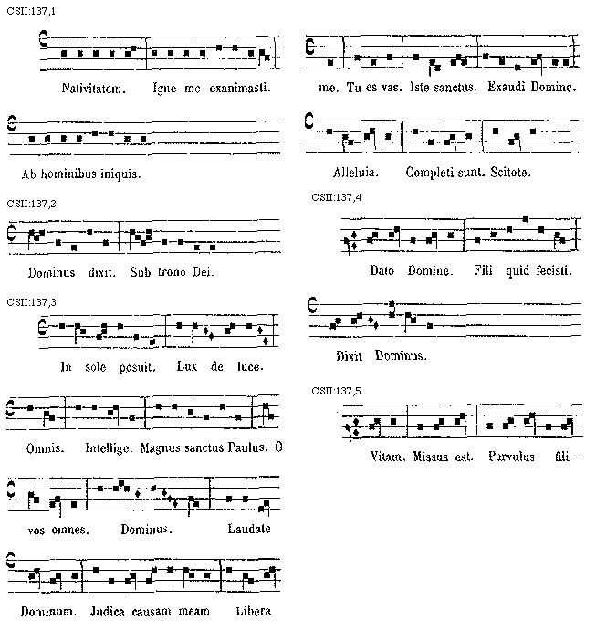 Servite Domino.--Tu Domine.--Exaudiat.--Conversus est.--Sic erunt.--Cum palma.--Neque--Euntes ibant.--Extende.--Tristitia vestra.--Delicta.--Johannes est.--Laurentius.--Magister quicumque.--Contritum est.