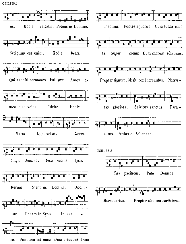 [138] [CSII:138,1; text: Hodie celestis. Potens es Domine. Scriptum est enim. Hodie beata. Qui sunt hi sermones. Isti sunt. Amen amen dico vobis. Dicite. Hodie. Maria. Opportebat. Gloria. Magi. Domine. Jesu omnis. Ipse. Iterum. Stent in. Domine. Quoniam. Ponam in Syon. Inundare. Scriptum est enim. Dum ortus est. Dum medium. Fontes aquarum. Cum turba multa. Super solum. Dum sacrum. Martinus. Propter lignum. Misit rex incredulus. Nativitas gloriosa. Spiritus sanctus. Paraclitus. Paulus et Johannes.] [ODOINT 19GF]