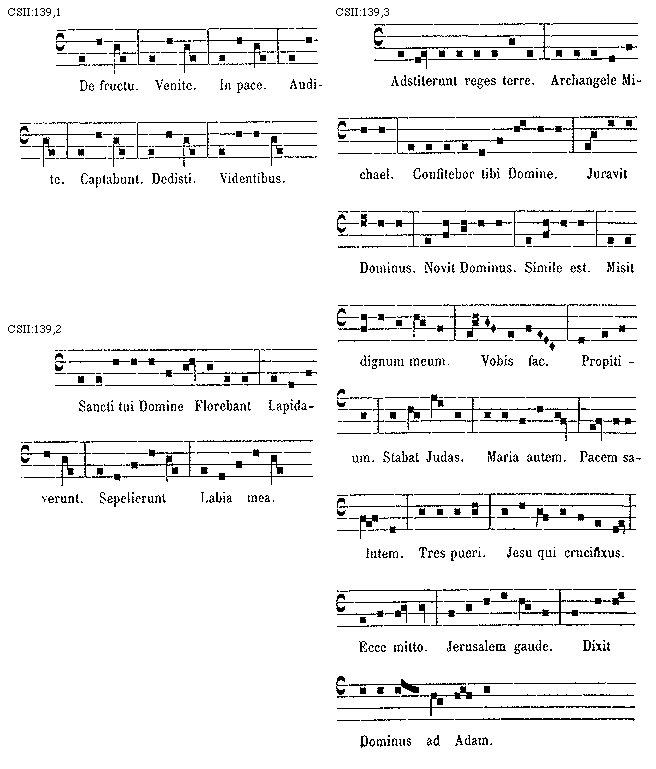 [CSII:139,3; text: Adstiterunt reges terre. Archangele Michael. Confitebor tibi Domine. Juravit Dominus. Novit Dominus. Simile est. Misit dignum meum. Vobis fac. Propitium. Stabat Judas. Maria autem. Pacem salutem. Tres pueri. Jesu qui crucifixus. Ecce mitto. Jerusalem gaude. Dixit Dominus ad Adam.] [ODOINT 20GF]
