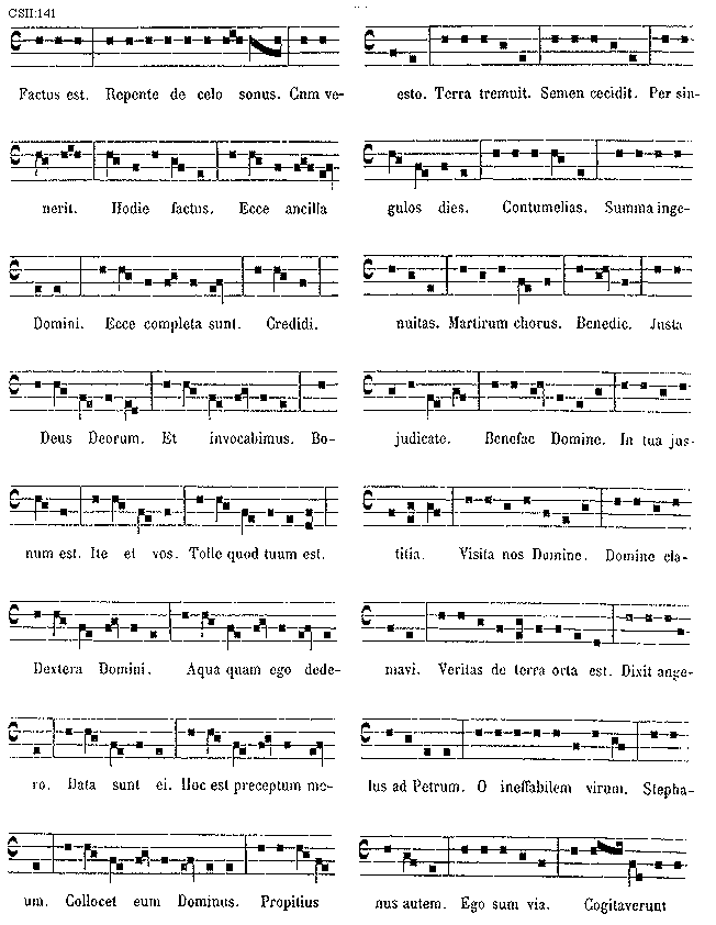 [141] [CSII:141; text: Factus est. Repente de celo sonus. Cnm venerit. Hodie factus. Ecce ancilla Domini. Ecce completa sunt. Credidi. Deus Deorum. Et invocabimus. Bonum est. Ite et vos. Tolle quod tuum est. Dextera Domini. Aqua quam ego dedero. Data sunt ei. Hoc est preceptum meum. Collocet eum dominus. Propitius esto. Terra tremuit. Semen cecidit. Per singulos dies. Contumelias. Summa ingenuitas. Martirum chorus. Benedic. Justa judicate. Benefac Domine. In tua justitia. Visita nos Domine. Domine clamavi. Veritas de terra orta est. Dixit angelus ad Petrum. O ineffabilem virum. Stephanus autem. Ego sum via. Cogitaverunt] [ODOINT 22GF]