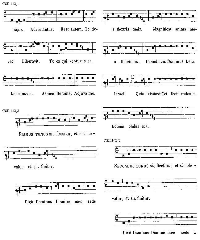 [CSII:142,2; text: Primus tonus sic flectitur, et sic elevatur et sic finitur. Dixit Dominus Domino meo sede a dextris meis. Magnificat anima mea Dominum. Benedictus Dominus Deus Israel. Quia visitavit et fecit redemptionem plebis sue.] [ODOINT 23GF]