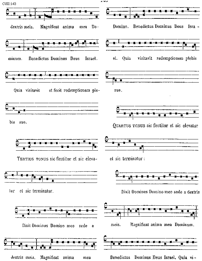 [143] [CSII:143; text: dextris meis. Magnificat anima mea Dominum. Benedictus Dominus Deus Israel. Quia visitavit et fecit redemptionem plebis sue. Tertius tonus sic flectitur et sic elevatur et sic terminatur. Quartus tonus sic flectitur et sic elevatur et sic terminatur: Dixit Dominus Domino meo sede a dextris meis. Magnificat anima mea Domino. Quia visitavit redemptionem plebis sue. ] [ODOINT 24GF]