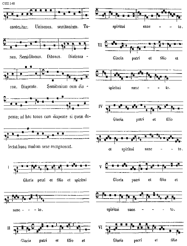[148] [CSII:148; text: contexitur. Unisonus. semitonium. Tonus. Semiditonus. Ditonus. Diatessaron. Diapente. Semitonium cum diapente; ad hec tonus cum diapente si quem delectat hunc modum sese recognoscat. I, II, III, IV, V, VI, Gloria patri et filio et spiritui sancto.] [ODOINT 29GF]