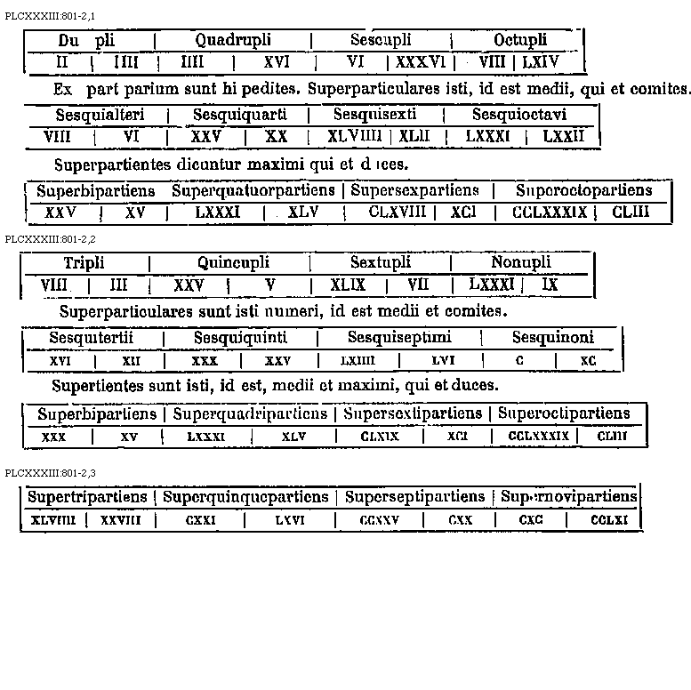 [PLCXXXIII:801-2,1; text: Dupli, Quadrupli, Sescupli, Octupli, II, IIII, XVI, VI, XXXVI, VIII, LXIV, Ex part parium sunt hi pedites. Superparticulares isti, id est medii, qui et comites. Sesquialteri, Sesquiquarti, Sesquisexti, Sesquioctavi, XX, XLVIII, XLII, LXXXI, LXII, Superpartientes dicuntur maximi qui et dices. Superbipartiens, Superquatuorpartiens, Supersexpartiens, Superoctopartiens, XXV, XV, XLV, CLXVIII, XCI, CCLXXXIX, CLIII] [ODORH 02GF]