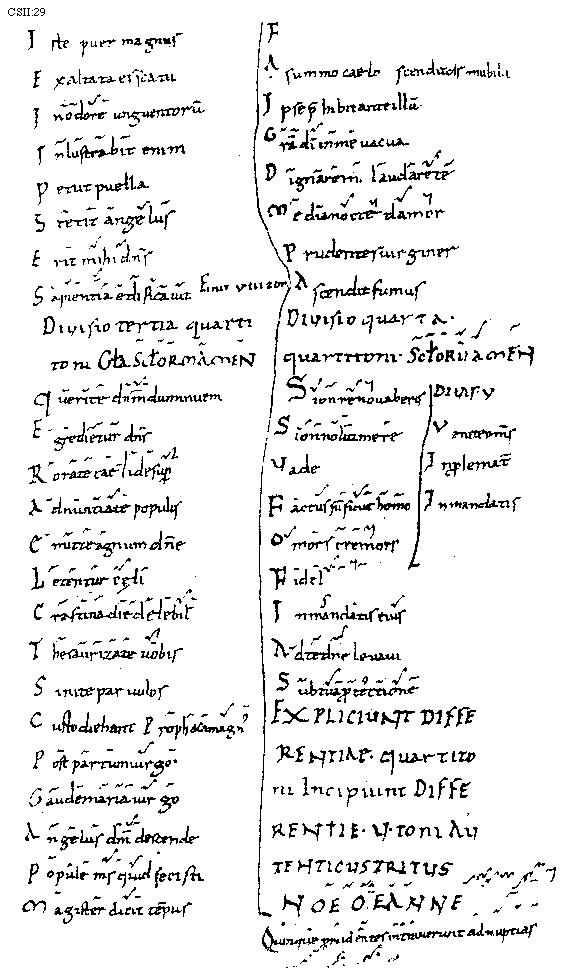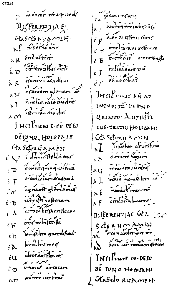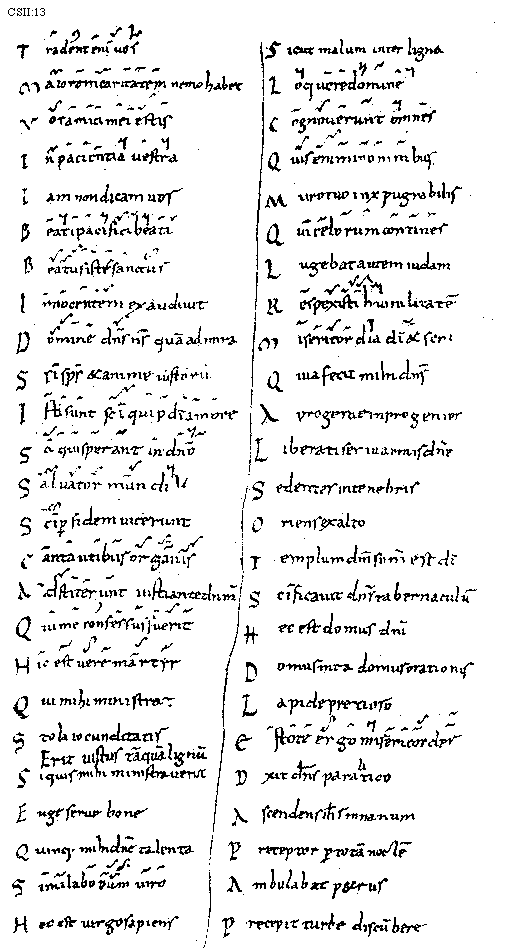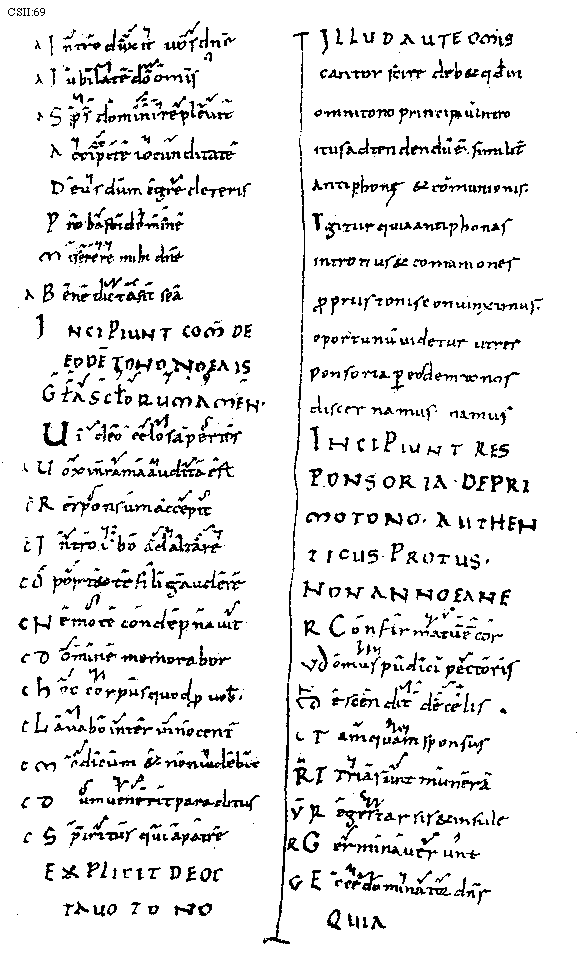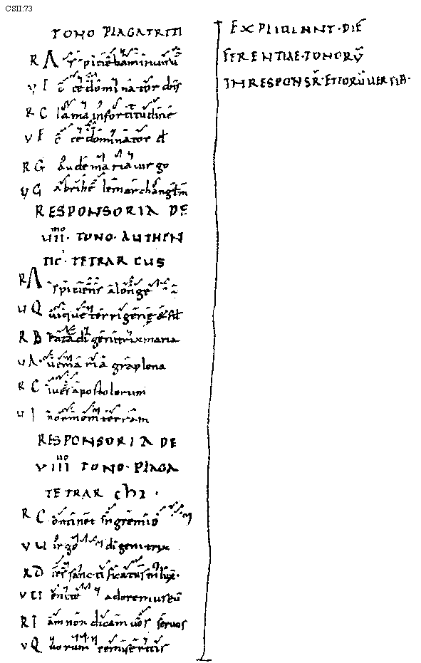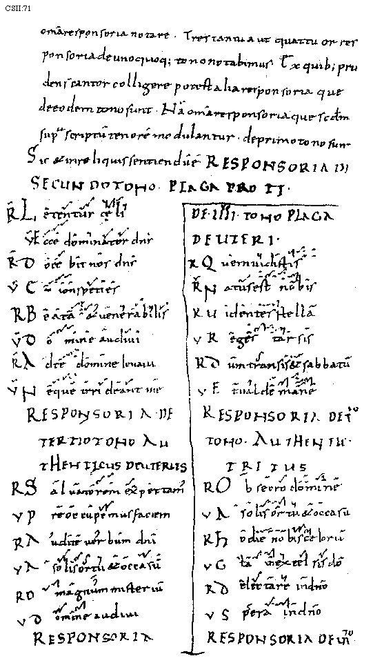 [70] Omnia responsaria notare, tres tantum aut quatuor responsoria de unoquoque tono notabimus. Ex quibus prudens cantor colligere potest alia responsoria, que secundum suprascriptum tenorem modulantur, de primo tono sunt. Sic et in reliquis sentiendum est.