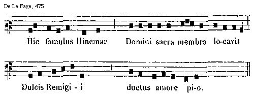 [De La Fage, 475; text: Hic famulus Hincmar Domini sacra membra locavit Dulcis Remigii ductus amore pio.] [REMVIT 01GF]
