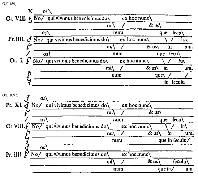 [180] Prima descriptiuncula proti modi [signum], secunda deuteri [signum], tertia triti [signum]. quarta tetrardi [signum]; quinta rursus eiusdem quae prima. Atque ad hunc modum, ut dictum est, quodcumque melum transposueris, in aliam modi speciem mox vertetur. Et si maior sit tropi mutatio, maior quoque tropus erit, in quemcumque fuerit transmutatus.