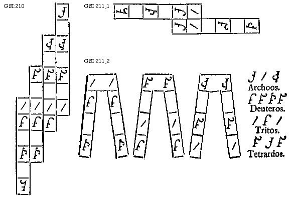 Quod itaque sono archoo [signum] incipit ac finitur, Pentachordum primum vocamus, et constat duobus tonis, semitonio et tono. Quod sono [signum] deutero, pentachordum secundum; et constat tribus tonis et semitonio. Quod sono [signum] trito, pentachordum tertium; et constat semitonio atque tribus tonis. Quod sono tetrardo, pentachordum quartum; et constat tono ac semitonio, et duobus tonis.