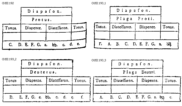 [GSII: 192; text: Diapason., Protus. Tonus. Diapente. Diatessaron. Tonus. C. D. E. F. G. a. b[sqb]. c. d. e.] [THEMUS 01GF]