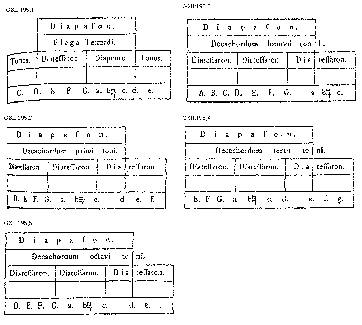 [195] [GSII:195,1; text: Diapason. Plaga Tetrardi. Tonus. Diatessaron., Diapente. C. D. E. F. G. a. b[sqb]. c. d. e.] [THEMUS 03GF]