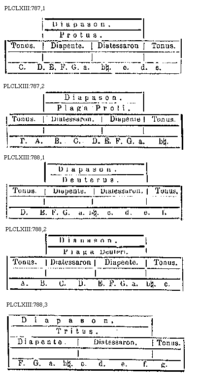 Protus autem, id est primus, constituitur ex omnibus primis; deuterus, id est secundus, ex omnibus secundis; tritus, id est tertius, ex omnibus tertiis; tetrardus, id est quartus, ex omnibus quartis, quos ideo graecis nuncupationibus nos nominamus, quia eos ita vocat generalis usus, et quia Graeci forsitan diligentius regulis inhaerent naturalibus. Protus itaque constat ex duabus primis speciebus diatessaron, et prima specie diapente, et duabus primis diapason. Hujus exemplum habemus antiphonam Domine non est alius, quae in letaniis scripta invenitur. Incipitur enim in A. gravi et permeat (permanet) usque ad (in) d. acutum: quae duae chordae omnes primas species includunt.
