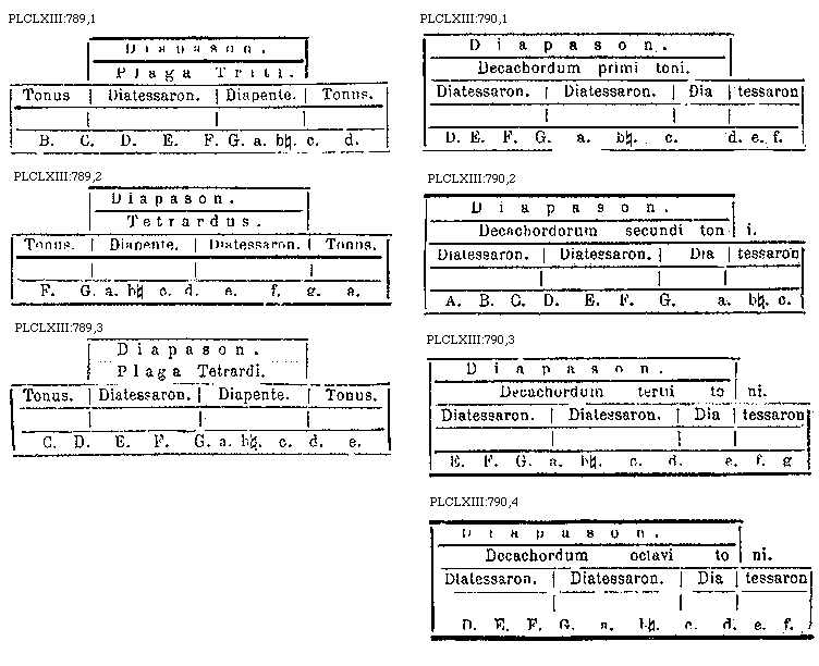Dispositis itaque (his) inter duas chordas (chordis) alias majus spatium cernitur, ut inter [Gamma] et A. et inter A. et B. alias minus ut inter B. et C. et reliqua (et sic de aliis). Et majus quidem spatium tonus dicitur, minus vero (dicitur) semitonium, semis videlicet, id est, non plenus tonus. Item in tribus chordis (tum alicubi) ditonus est, id est, duo toni, ut a c. ad e. tum (alicubi vero) semiditonus, qui habet tantum tonum et semitonium, ut a D. ad F. et reliqua (et sic in caeteris). Diatessaron autem est, cum inter quatuor chordas duo sunt toni, et unum semitonium, ut ab A. ad D. et a B. ad E. et reliqua. Diapente vero uno tono major est, constans quinque chordis, ut ab A. ad E. et a C. ad G. et reliqua. In sex vero chordis existunt diapente cum tono, ut a C. ad a. et diapente cum semitonio, ut ab e. in c. (ut a C. ad a vel ab E. in c.) Denique diapason in octo (chordis) existit, ut ab A. in a. et a B. in [sqb]. et a C. in c. et caetera. Dicitur autem diatessaron, quasi de quatuor, sicut diapente quasi de quinque, quia tot chordas includunt. Diapason autem (dicitur) quasi de omnibus, eo quod (quoad) omnes modos vocum includat.