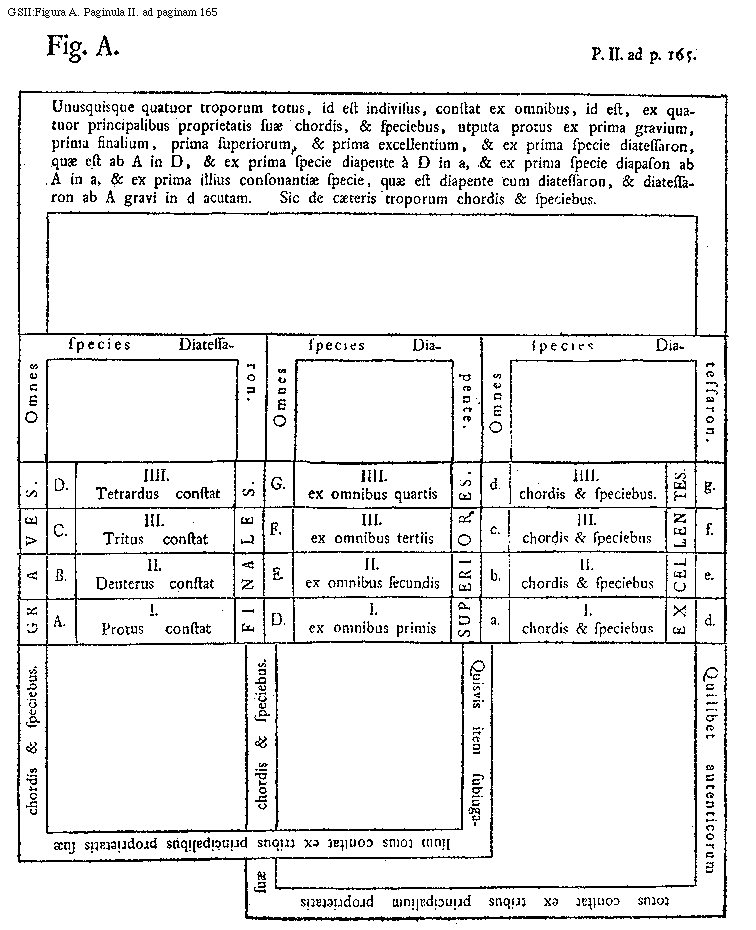 [GSII:Figura A. Paginula II. ad paginam 165; text: Unusquisque quatuor troporum totus, id est indivisius, constat ex omibus, id est, ex quatuor principalibus proprietatis suae chordis, et speciebus, utputa protus ex prima gravium, prima finalium, prima superiorum, et prima excellentium, et ex prima specie diatessaron, quae est ab A in D, et ex prima specie diapente a D in a, et ex prima specie diapason ab A in a, et ex prima illius consonantiae specie, quae est diapente cum diatessaron, et diatessaron ab A gravi in d acutam. Sic de caeteris troporum chordis et speciebus. Omnes species Diatessaron. Omnes species Diapente. Graves. A. B. C. D. Finales. D. E. F. G. Superiores. a. b. c. d. Excellentes. d. e. f. g. I. Protus constat ex omnibus primis chordis et speciebus. II. Deuterus constat ex omnibus secundis chordis et speciebus. III. Tritus constat ex omnibus tertiis chordis et speciebus. IIII. Tetrardus constat ex omnibus quartis chordis et speciebus. Quilibet autenticorum totus constat ex tribus principalium proprietatis suae chordis et speciebus. Quisvis item subiugalium totus constat ex tribus principalibus proprietatis suae chordis et speciebus.] [WILMU 01GF]