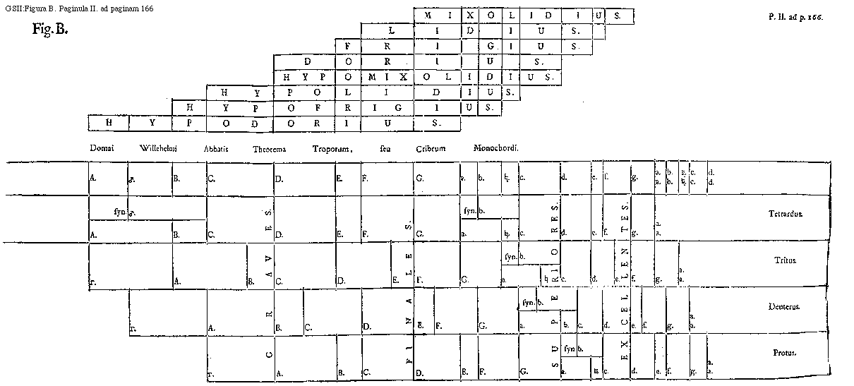 [GSII:Figura B. Paginula II. ad paginam 166; text: Domni Willehelmi Abbatis Theorema Troporum, seu Cribrum Monochordi. Hypodorius. Hypolidius. Hypomixolidius. Dorius. Frigius. Lidius. Mixolidius. Protus. Deuterus. Tritus. Tetrardus. Graves. Finales. Superiores. Excellentes. [Gamma]. A. synemmenon, B. C. D. E. F. G. a. b. [sqb]. c. d. e. f. g. aa. bb. [sqb][sqb]. cc. dd.] [WILMU 02GF]
